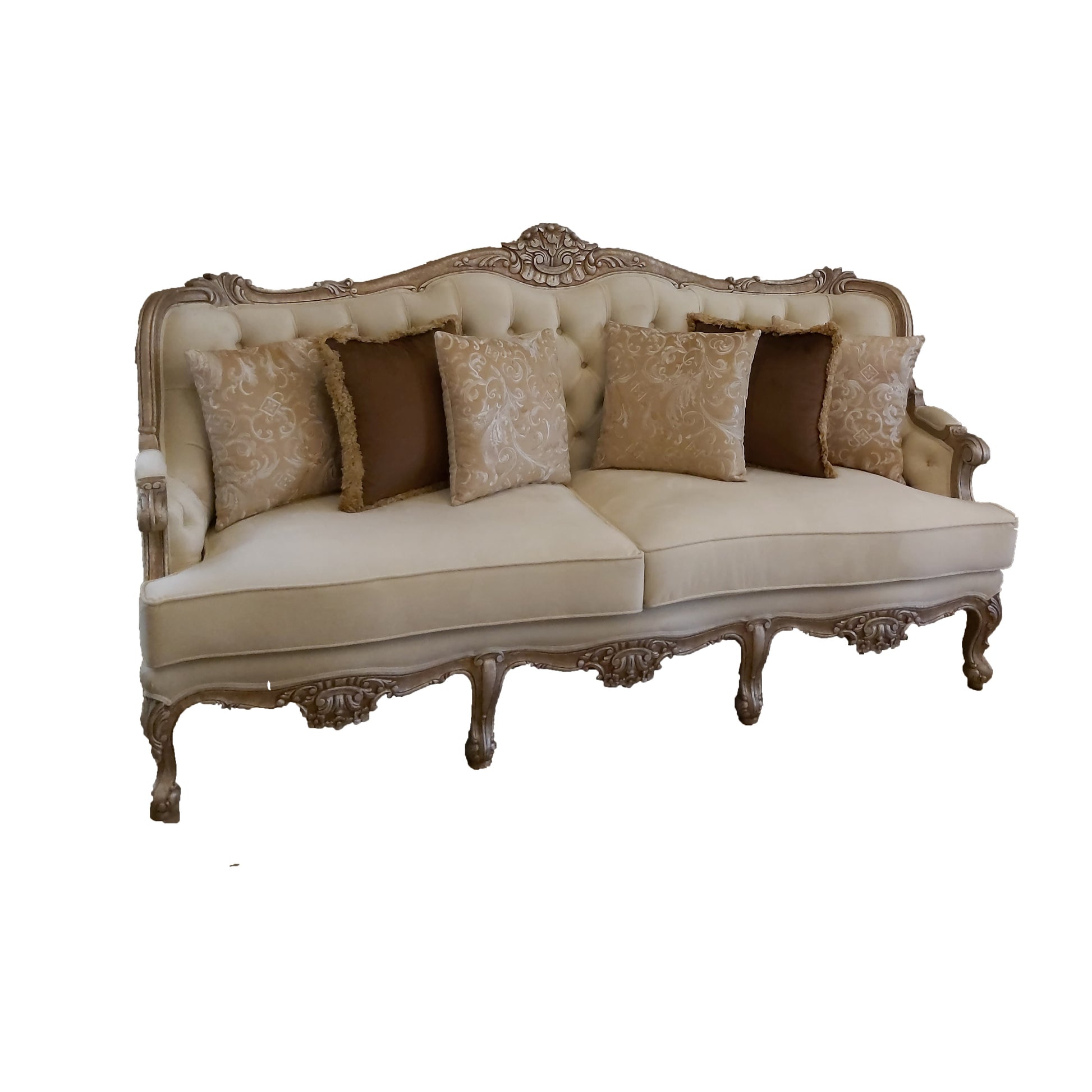 Tufted Cream Sofa with Floral Carving & Velvet Cushions