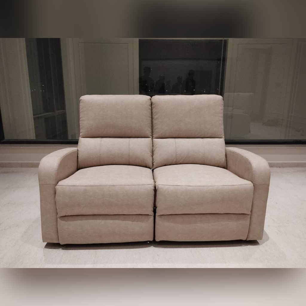 Upholstered in light beige, this compact dual recliner sofa is perfect for small spaces. Its manual reclining mechanism allows for relaxed movie nights or reading time. The structured form and soft padding give it a cozy yet modern appeal.