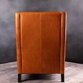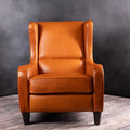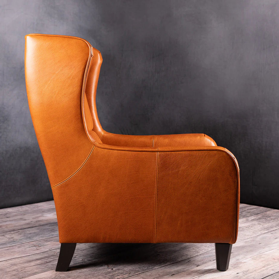 A uniquely styled armchair with dual-tone upholstery in mustard yellow and warm tan leather. The clean-lined silhouette and thick cushioning make it perfect for eclectic interiors.