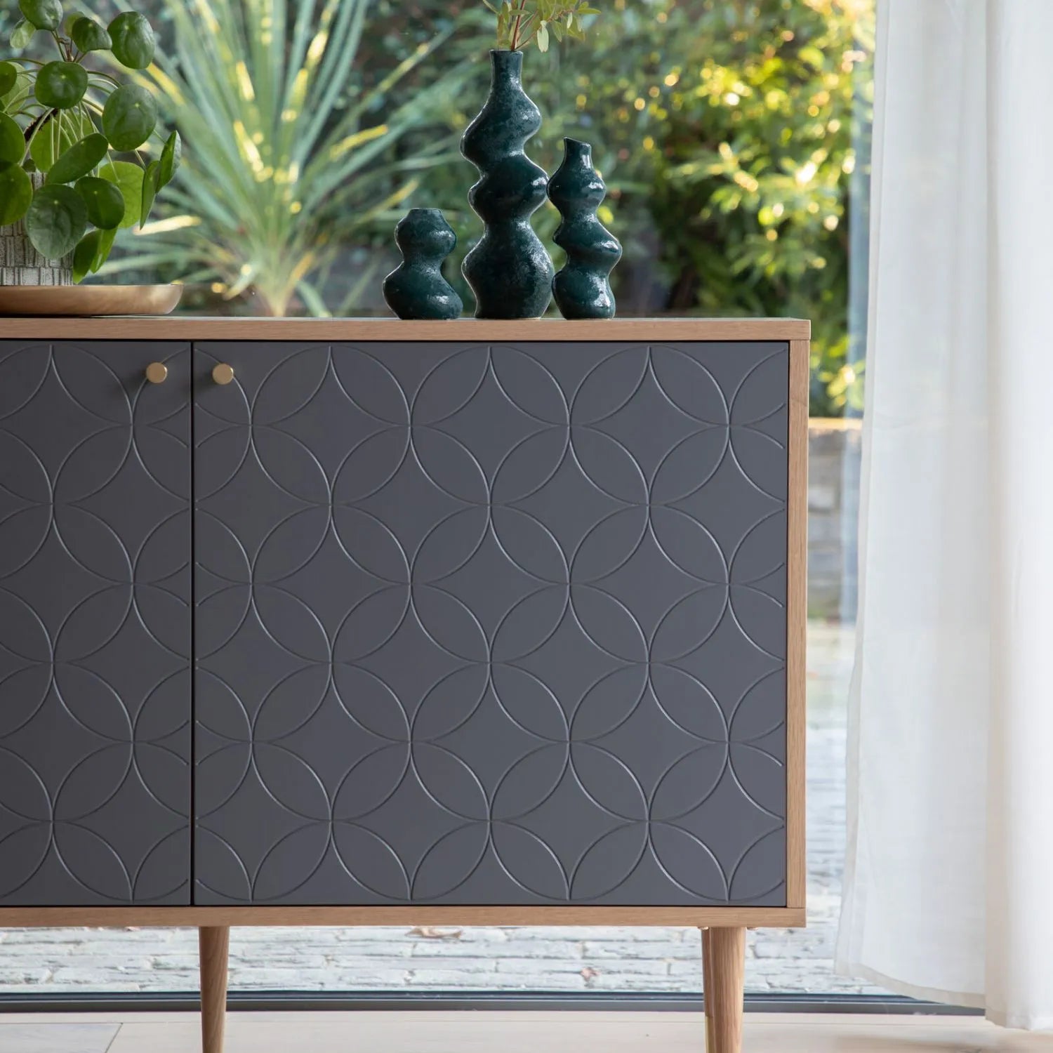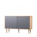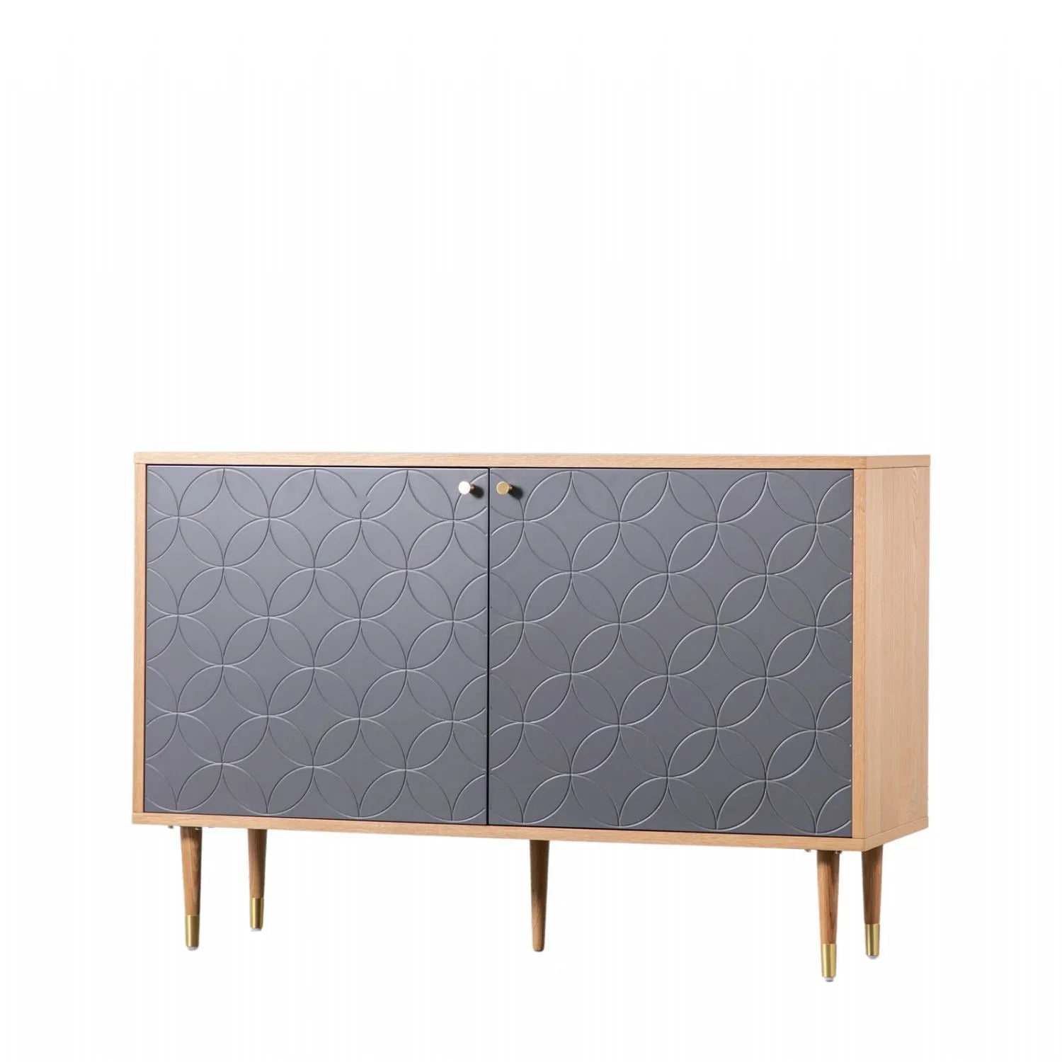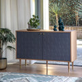 A mid-century modern delight, this sideboard pairs warm wooden framing with navy blue front panels, each detailed with a subtle diamond quilted texture. Supported by slim tapered legs, the design offers a perfect blend of retro flair and contemporary sophistication.
