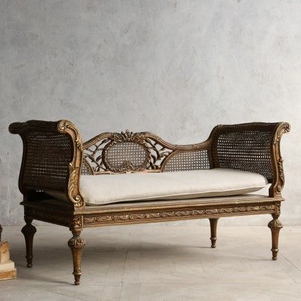 Combines light and dark wood finishes with a cane backrest and gold leaf carvings, offering a sophisticated antique aesthetic.
