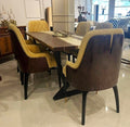 This stylish set combines mustard and walnut tones with curved high-back chairs in a split-fabric design. The wooden tabletop rests on angular black legs for a bold, modern contrast.