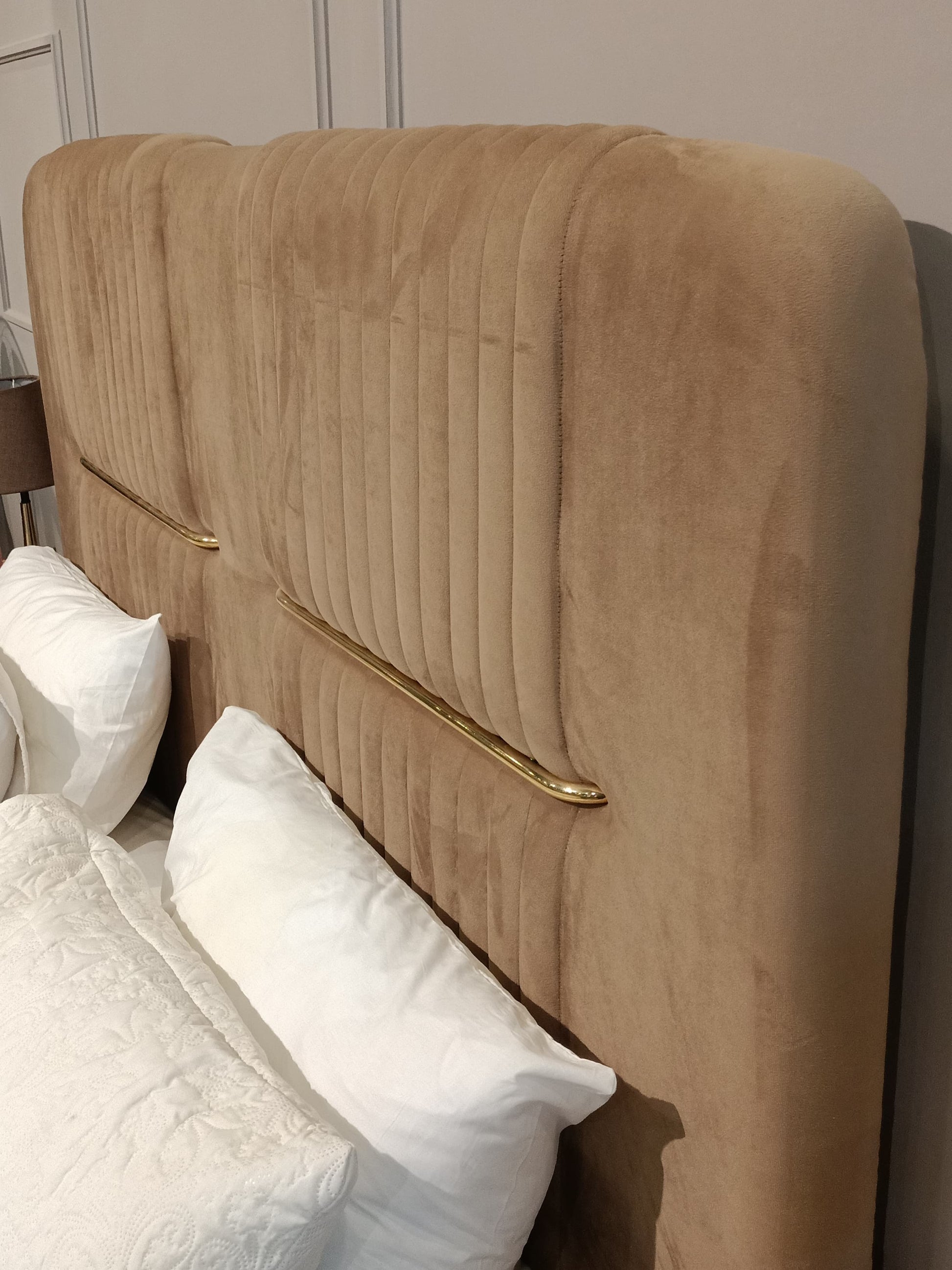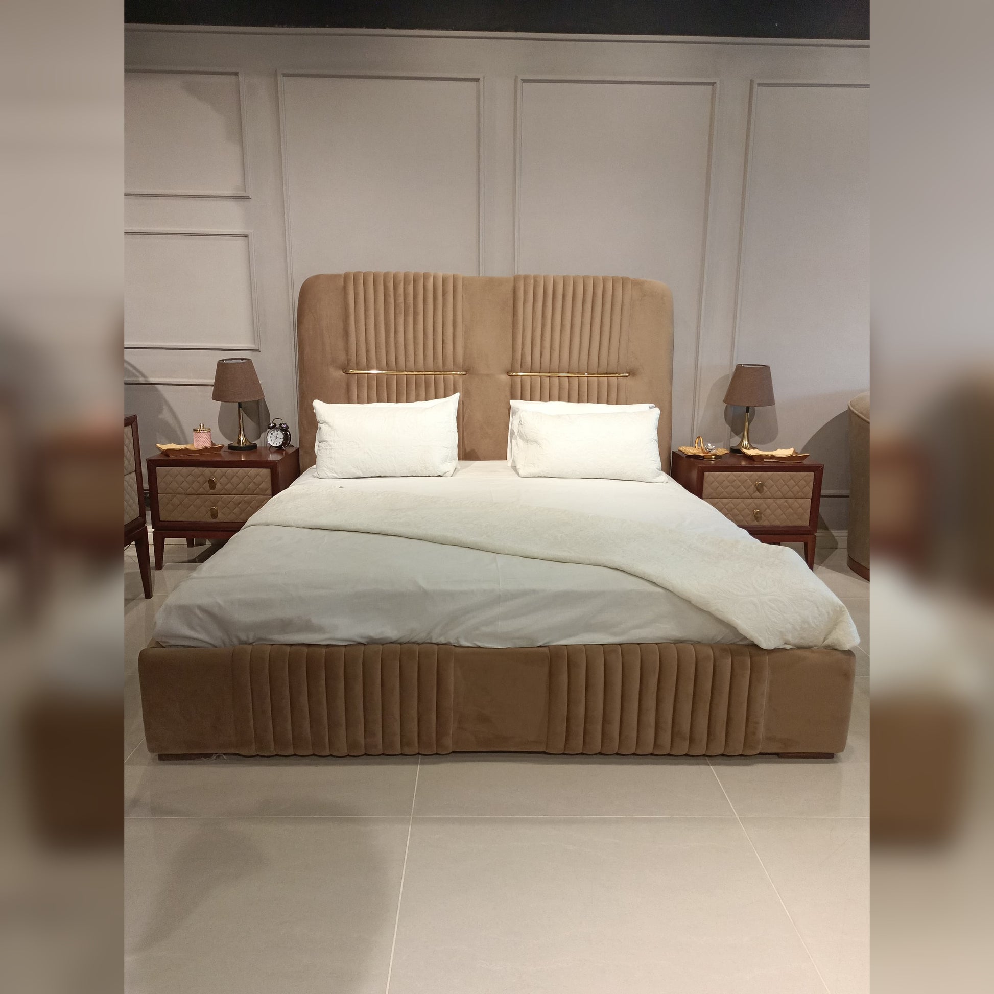 A king-sized bed featuring rich velvet upholstery in earthy tones. The padded headboard and frame offer both luxury and comfort. A bold centerpiece for opulent bedrooms.