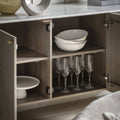 This minimalist sideboard features vertical fluted detailing across its façade, finished in a soft neutral beige tone. The understated gold hardware and sleek silhouette give it a modern, Scandinavian-inspired elegance, ideal for spaces that value clean lines and refined textures.