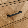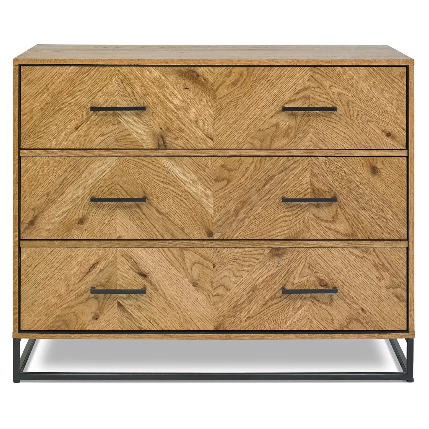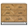 This standout chest combines angled wood grain patterns with a dark metal frame and base. Three spacious drawers are adorned with aged brass handles for an industrial-meets-vintage look. A perfect anchor piece for lofts or rustic-modern homes.