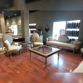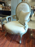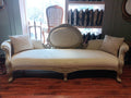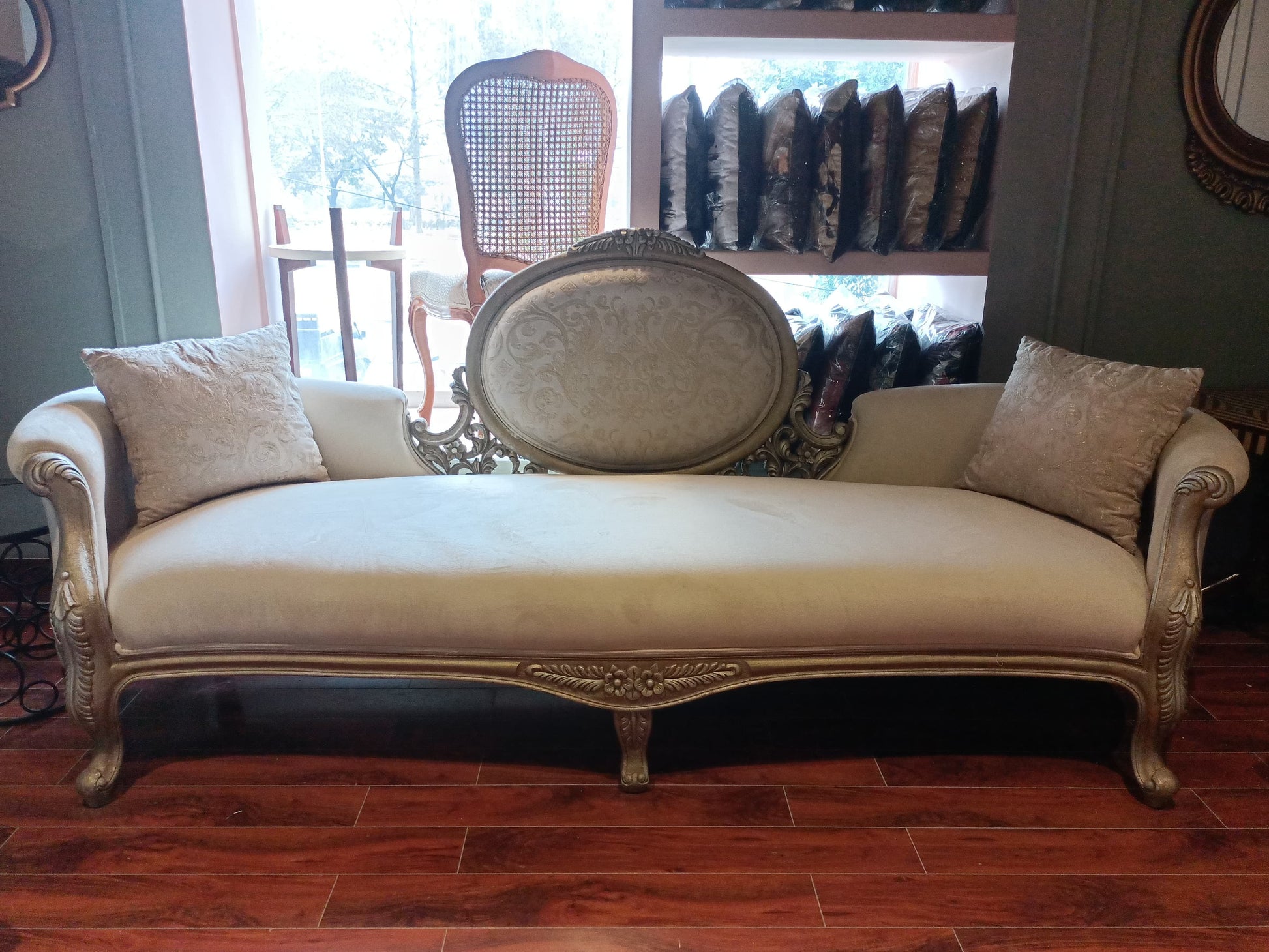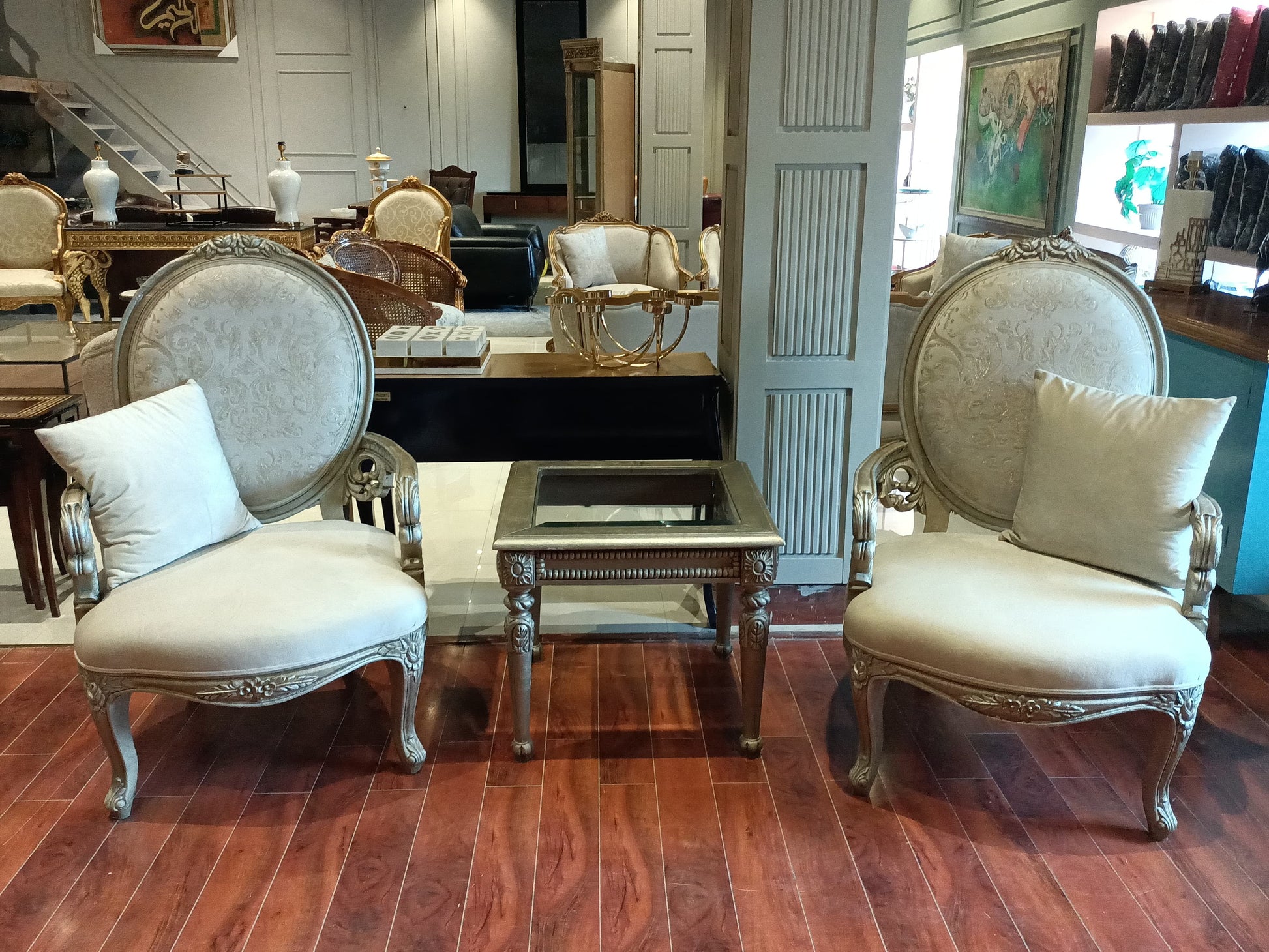 A graceful cream settee with two chairs a tufted back and scroll arms. Its gold-painted frame and soft upholstery enhance its classic charm. Ideal for dressing rooms or vintage lounges.