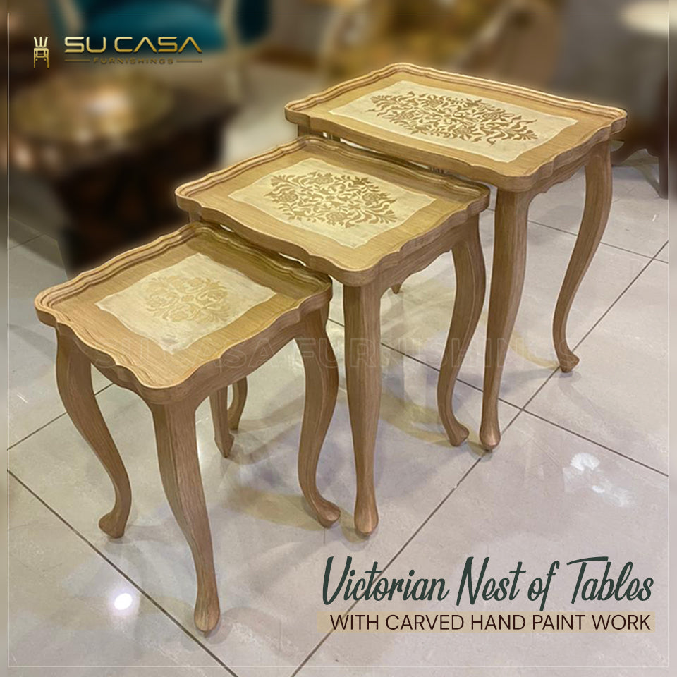 Elegantly carved from polished wood with golden inlay, this set boasts Victorian-style cabriole legs. Its antique floral patterns add opulence and historical charm. Ideal for luxury drawing rooms and vintage-themed interiors.