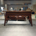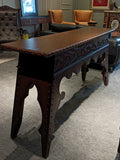 Crafted from rich dark wood, this vintage desk features ornate detailing and turned legs. A blend of artistry and utility for refined workspaces. Ideal for home libraries or executive offices.
