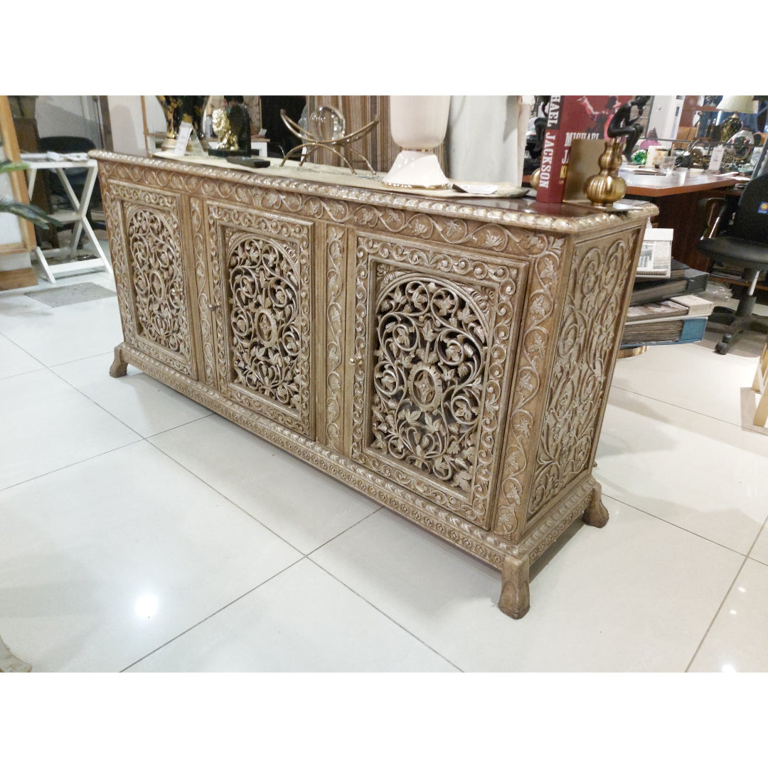 Wrapped in a brushed antique gold tone, this botanical-themed sideboard is detailed with intricate floral artwork. The gently bowed shape and tapered legs add to its vintage character, making it perfect for spaces that blend old-world charm with artistic flair.