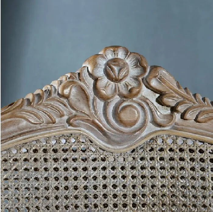 A rustic wooden frame paired with woven cane panels and carved floral detailing, complemented by rich velvet cushions in burnt orange and maroon.