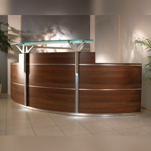 Features rich walnut woodgrain flanked with stainless supports and frosted glass dividers. The extended curved design allows multiple user stations with privacy. Suitable for hotels, medical centers, or premium showrooms.