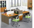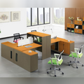Features a multi-unit modular layout in a warm cherry wood tone, accented with sleek lines and integrated pedestal drawers. Contrasting lime-green chairs add a vibrant touch. It’s suitable for high-collaboration environments.