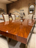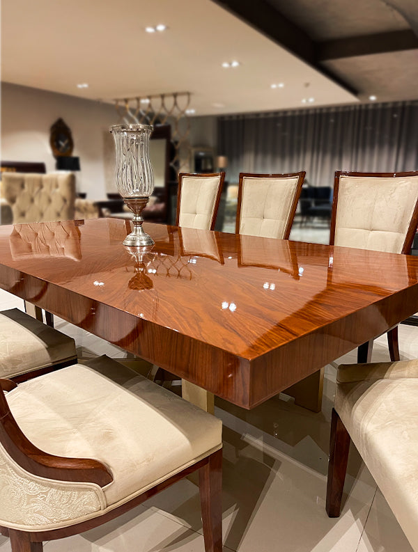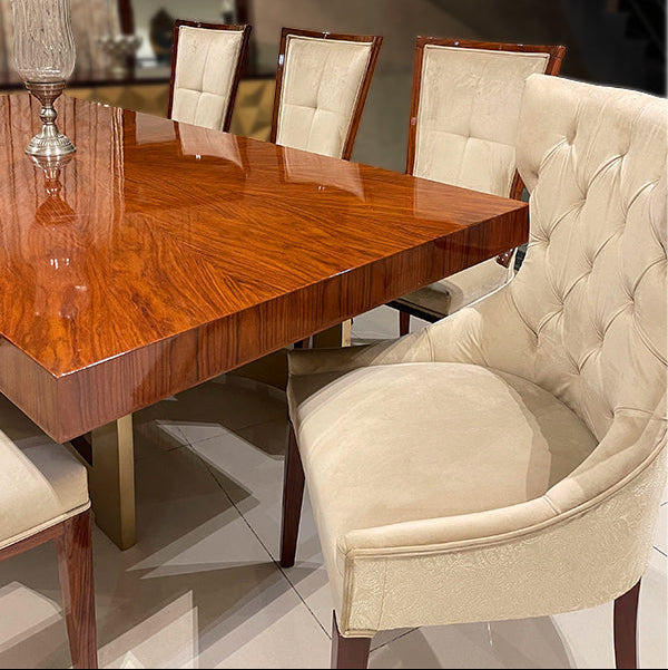 A highly polished wooden rectangular tabletop with a vivid grain pattern, supported by gold-toned metallic legs. Cream tufted chairs add softness and balance to the bold table design. This piece blends modern glam with classic textures seamlessly.