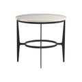 A sleek circular glass top with thin metal legs and a lower ring for support, combining functionality with a light aesthetic.